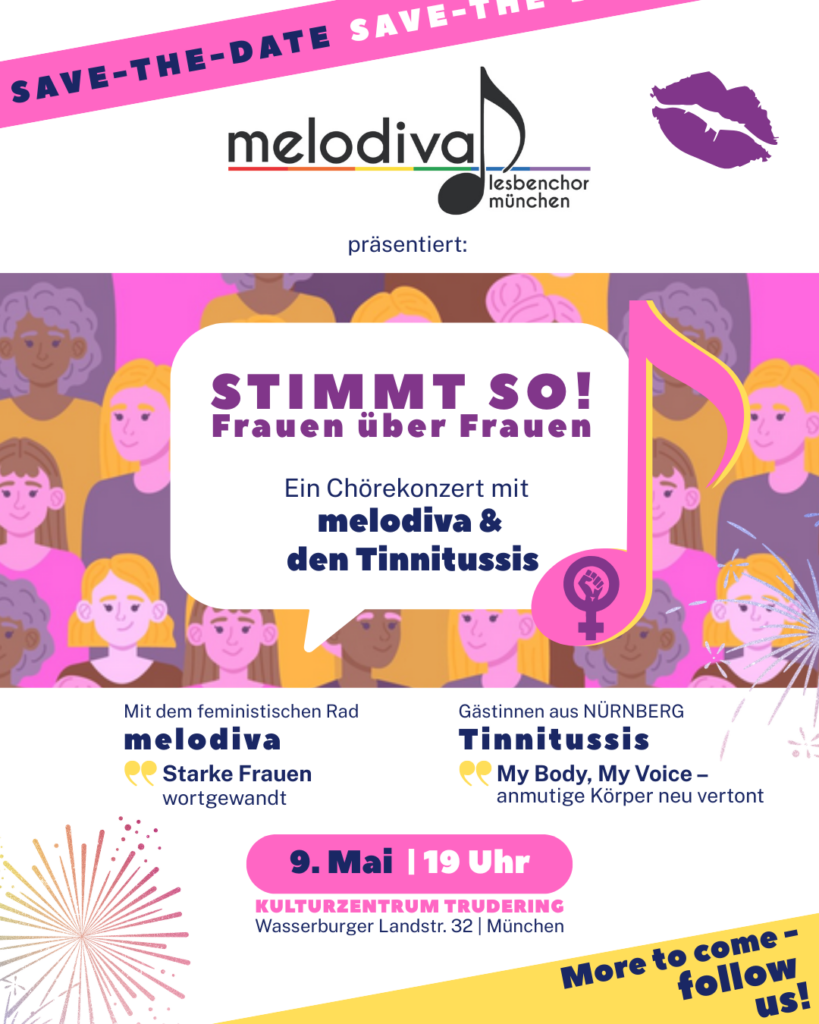 Am 9. Mai 2026 haben wir in Trudering die Tinnitussis aus Nürnberg zu Gast. Wir sind zwar nicht beim Frauenfußball, aber mit 2 × 45 Minuten zeigt jeder Lesbenchor Ausschnitte aus seinem Repertoire. Und wir schließen nicht aus, dass es in die Verlängerung geht.
